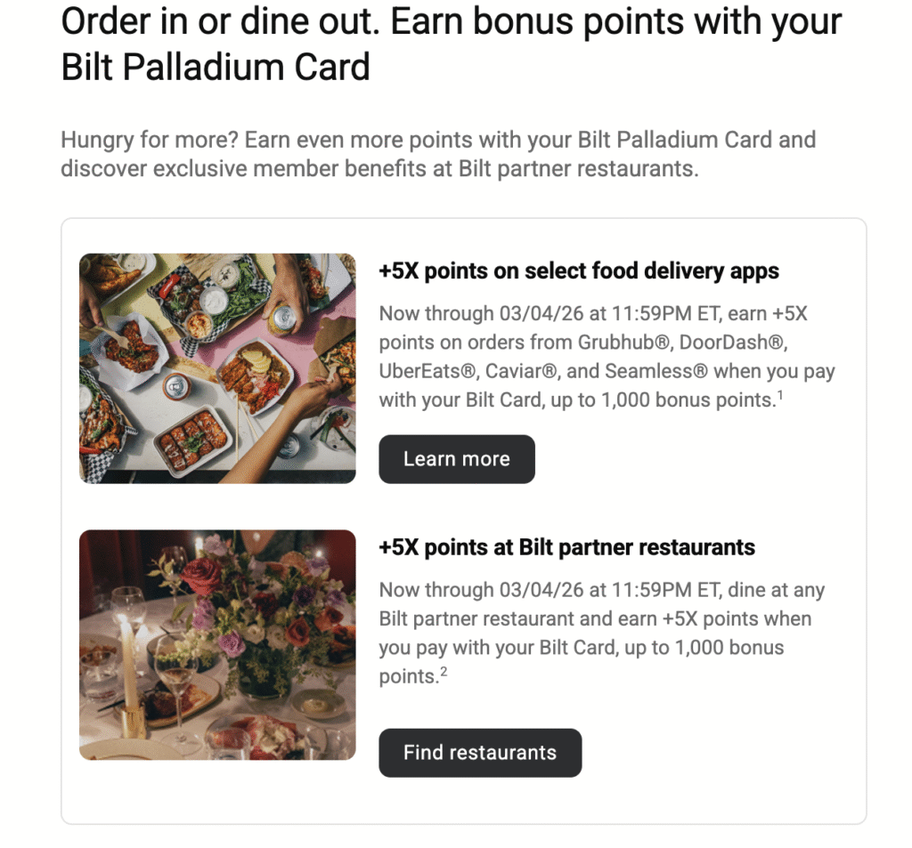 Cardholders should have received an email on February 26 with the subject line “Hungry for more? Earn even more points with your Bilt Card.” Mine arrived later in the day, however I could see these offers in my Bilt app before the email arrived.