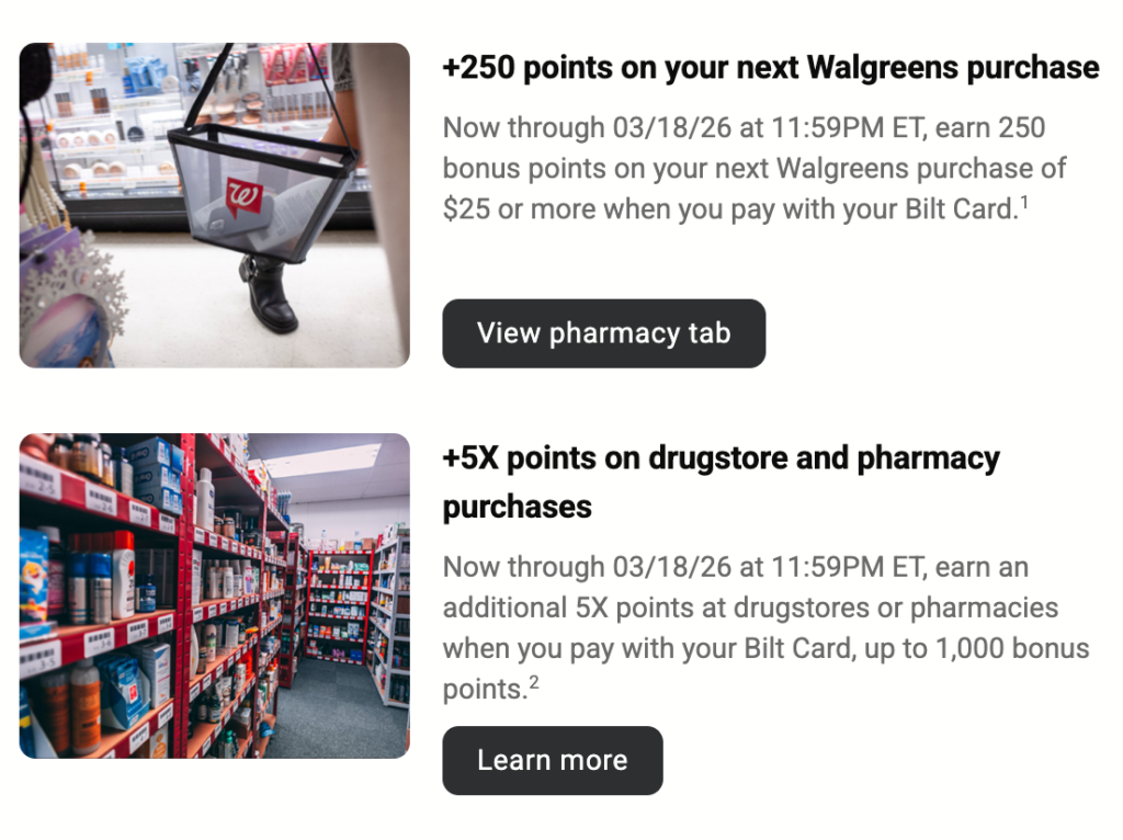 Cardholders should have received an email on March 12 with the subject line “Stock up. Earn up. Bonus points on eligible pharmacy runs.” Mine arrived later in the day, however I could see these offers in my Bilt app before the email arrived.