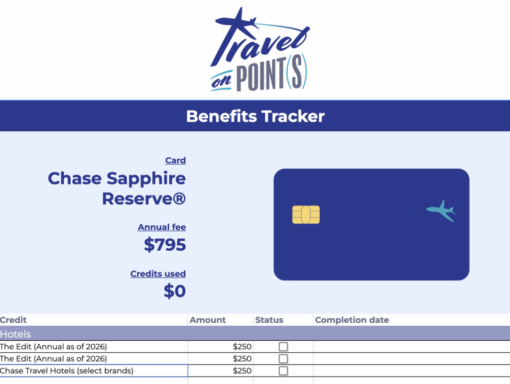 A new card's annual fee is always worth it in the first year. But after you've hit the signup bonus, it's not a bad idea to track how well you are—or aren't—using the perks that are meant to justify those ever-increasing annual fees. Hopefully this Chase Sapphire credit tracker tool helps you do just that. Looking for our Amex credits tracker? Find it here.