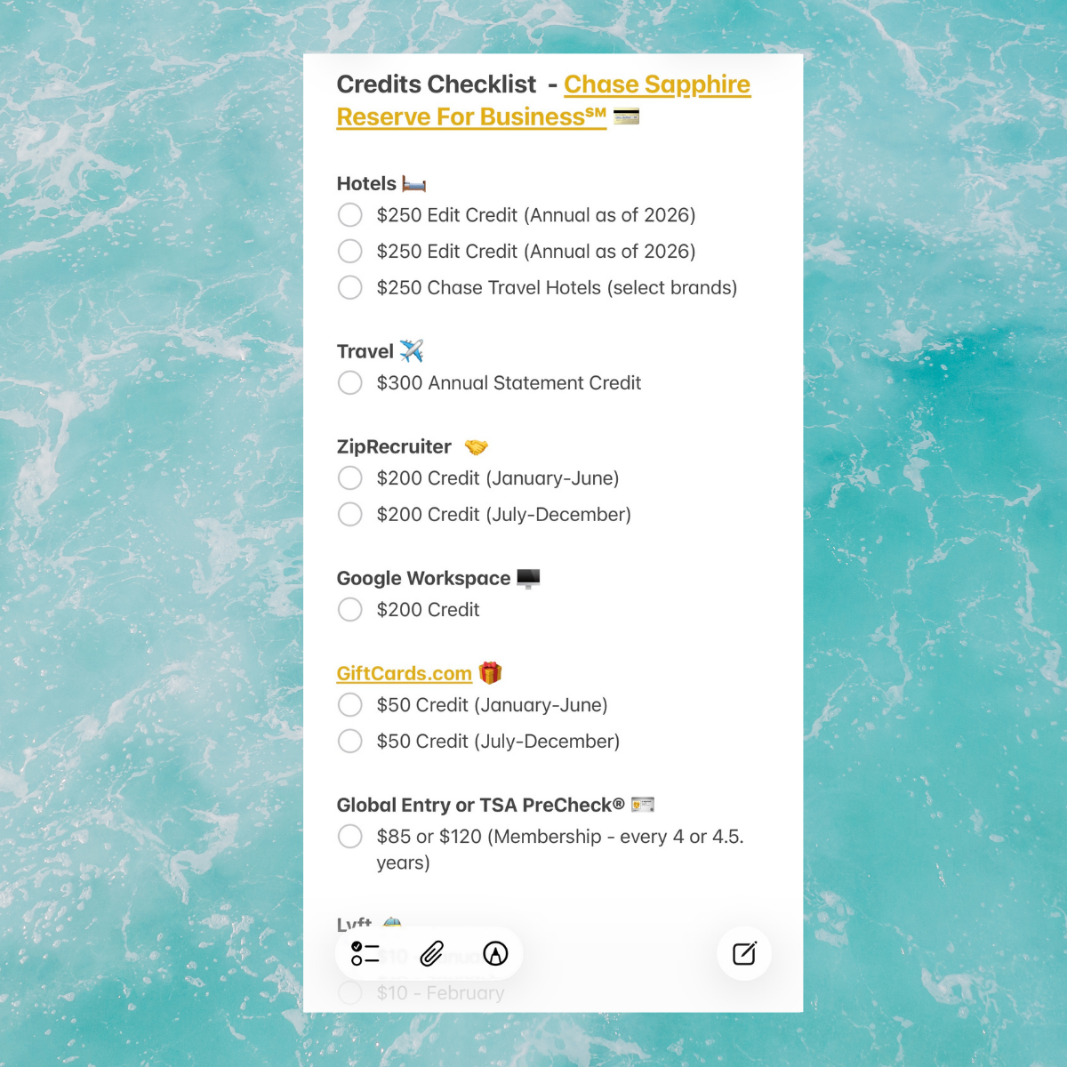 If you would like to use Apple notes checklists for your Chase Sapphire credit tracker then there may be an option for that as well.